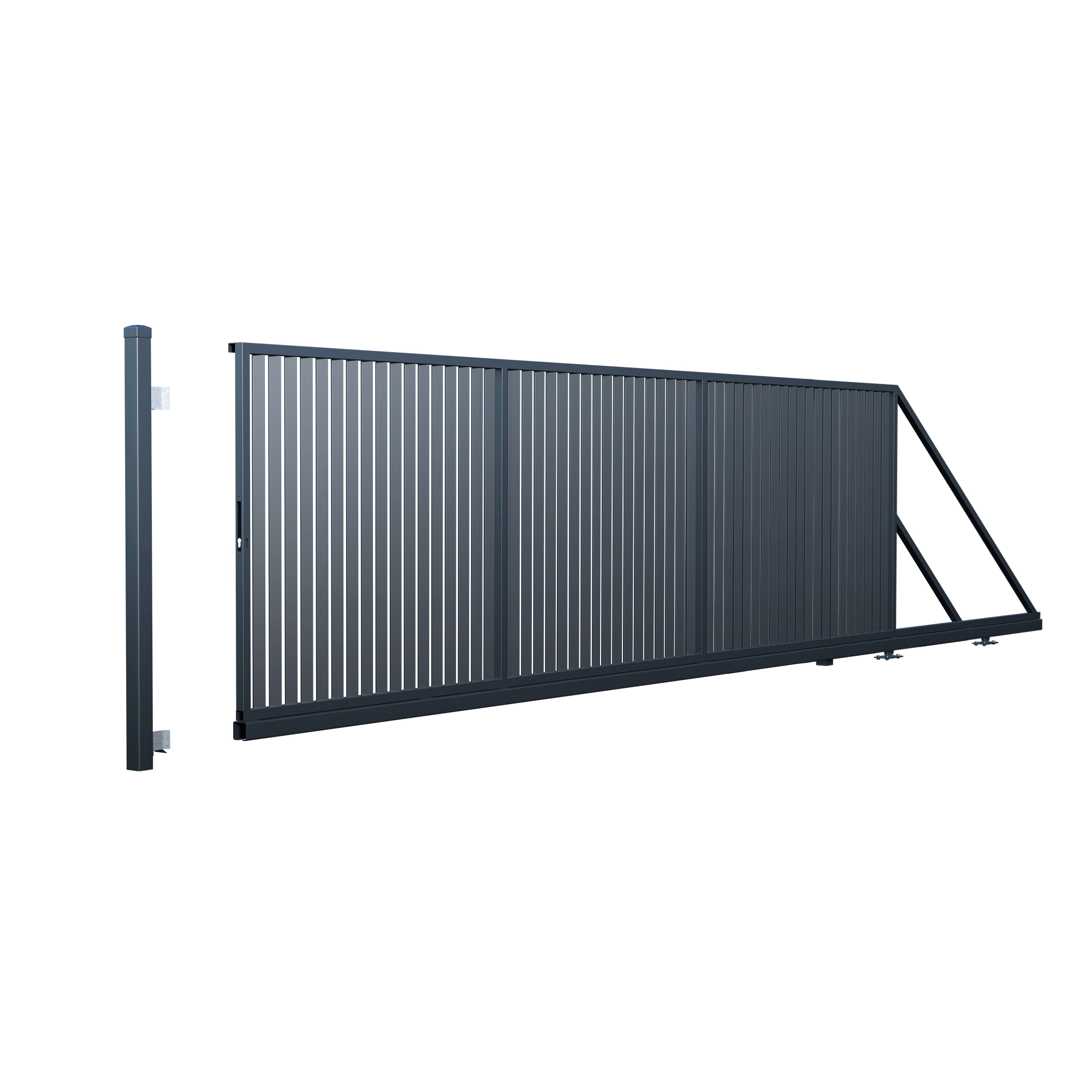 Kupując w naszym sklepie bramę przesuwną, otrzymujesz w zestawie dwa słupki – przelotowy i dojazdowy. Są one ważnym elementem konstrukcyjnym, ponieważ wyznaczają światło bramy, która porusza się po szynie przymocowanej wzdłuż ogrodzenia. Jeśli masz przygotowane murowane słupy, wówczas zalecamy montaż metalowych słupków za murowanymi słupami lub montaż słupków do muru. W przypadku montażu słupków do muru, pamiętaj także o zaopatrzeniu się w dodatkowe mocowania i kołki.